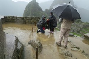 After catching our breath we continued up to another level and the spot for the famous “We are at Macchu Picchi” photo, at this time the view was clear with just a few clouds in nearby mountains and we were able to get some great photos. We wandered around a bit at this level feeling a drop in temperature and seeing the clouds come over and feeling the rain start. We decided to follow the steps down as the rain was coming dow