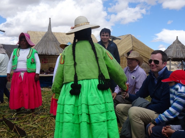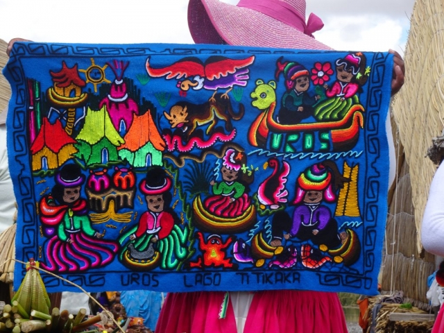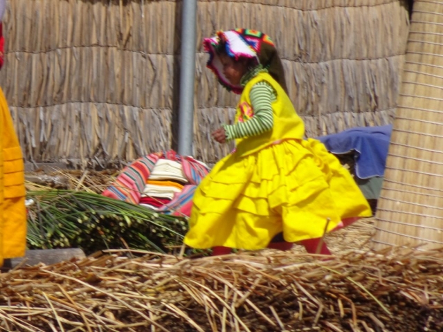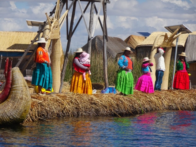 On Friday we joined a group tour of the floating Islands of Uros and Tequile island.   This was a well organised and interesting day trip.  We boarded our boat with mainly Spanish speakers  and headed off first to Uros floating Islands.   The Uros are a group of people who live on over 80 Islands of differing sizes that have been built out of reeds and a community of people, approx 2,500 live on these islands observing their own traditions and language. They even have junior school on the Islands.   It was really interesting to see the islands and learn about the people who live there.