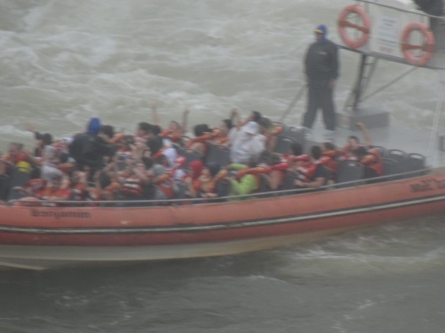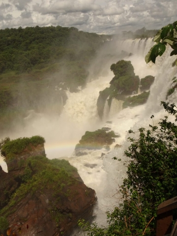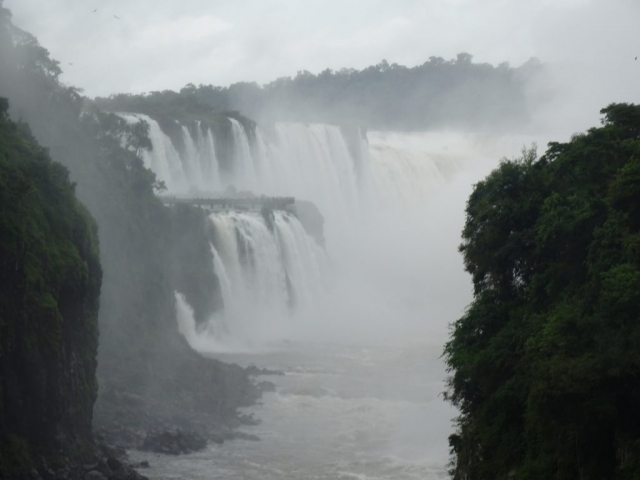 The walkways are raised on stilts over the lakes that feed the falls. They span from islet to islet, getting closer and closer to the throat, each section being noisier and wetter that the previous one. A couple of sections before the throat, is a wider part, with benches, where everyone dons their water proofs and wraps up anything that they don’t want to get wet. Another couple of spans and we were at the throat, which is a sort of giant sink hole in the middle of one of the lakes that feed the falls, where the cliff edge that forms that part of the main falls is cut sharply back into the middle of the lake. The result is a maelstrom of thundering brilliance, which you witness from a walkway that actually projects over the edge in places. Looking over the edge, you can see nothing in the whiteness except some birds soaring the spray.