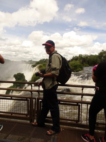 We set out on the walk around the Lower Falls, which started off fairly flat through dense rainforest, but soon started to descend increasingly steeply into the gorge of the river Iguazu. The rumble of the falls got louder, and the air got damper. As we approached, we saw some minor subsidiary falls, and then started to catch glimpses of the main sequence of falls arcing around above us. T he walkways were not too crowded, and we had no difficulty getting good pictures of the falls without fighting for space. This whole circuit, seemingly, took about 90 minutes.